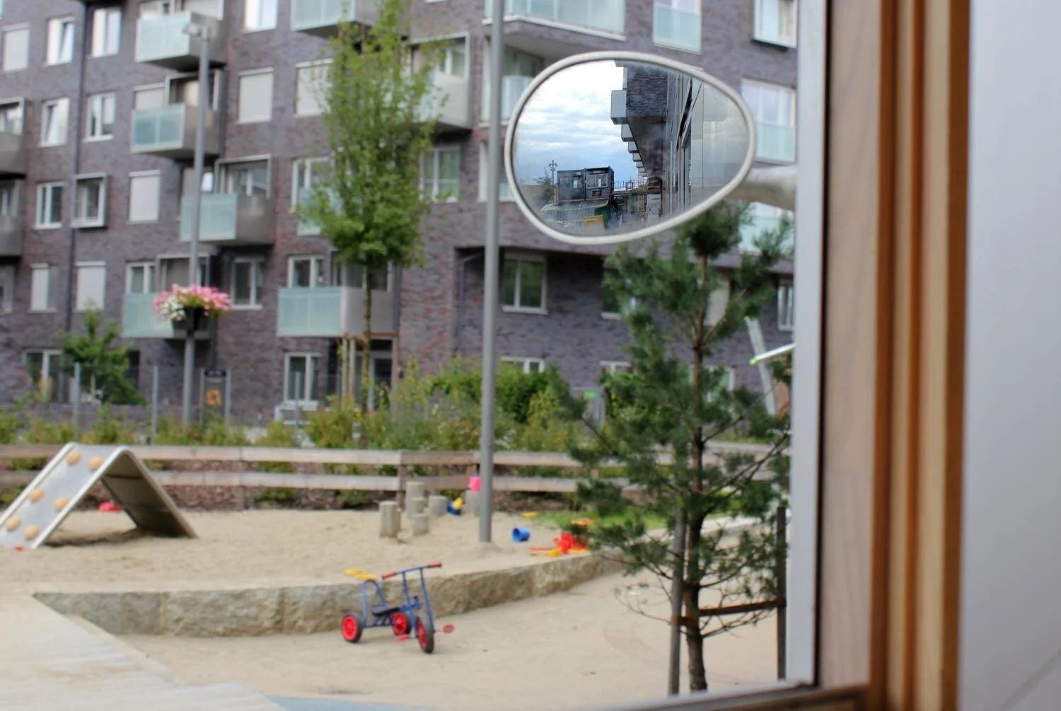 Utenfor det lille vinduet i trappen opp til andre etasje er det montert et sladrespeil fra en motorsykkel. Ved å se i dette får barna utsikt til Oslofjorden utenfor Sørenga.